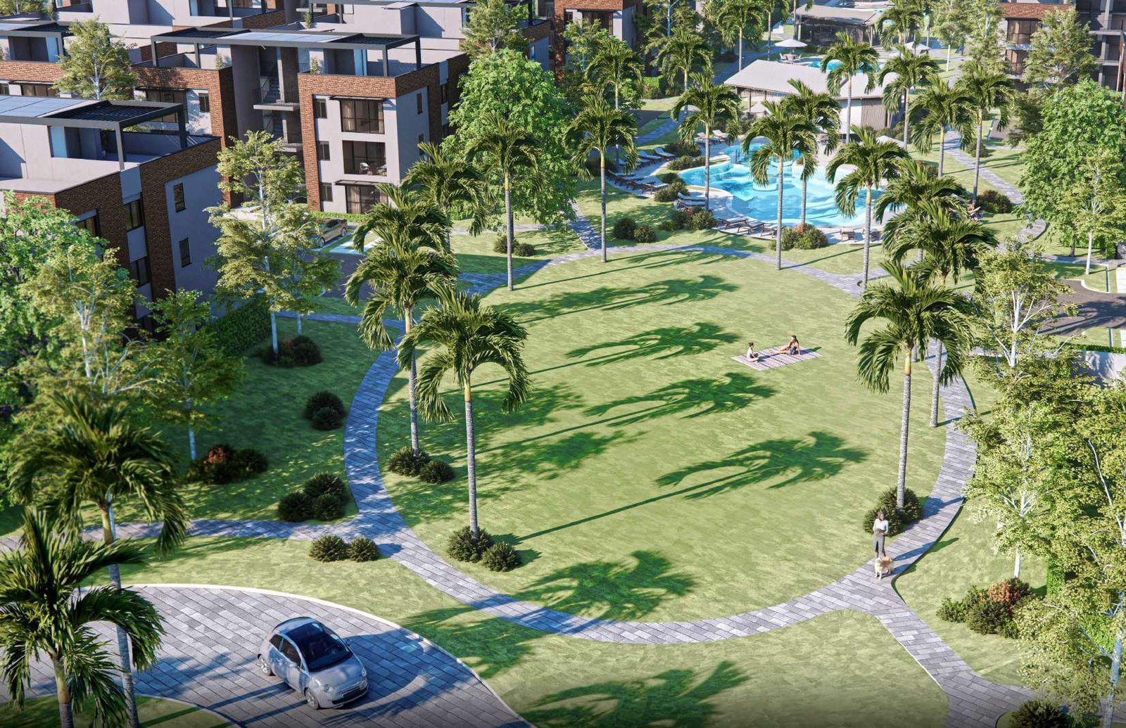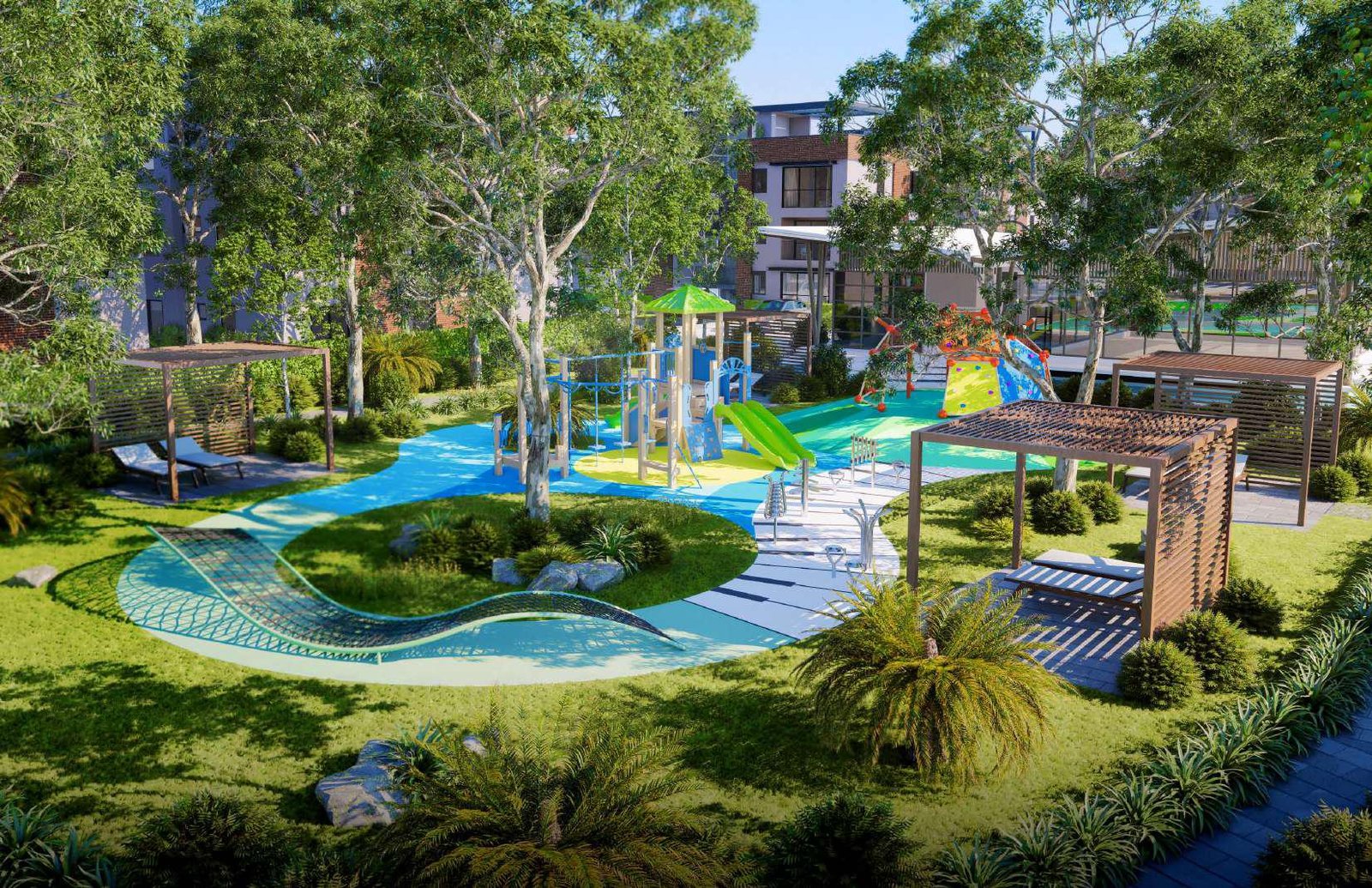 Una propuesta paisajística de 750 metros cuadrados con senderos al aire libre, ubicada dentro del complejo residencial