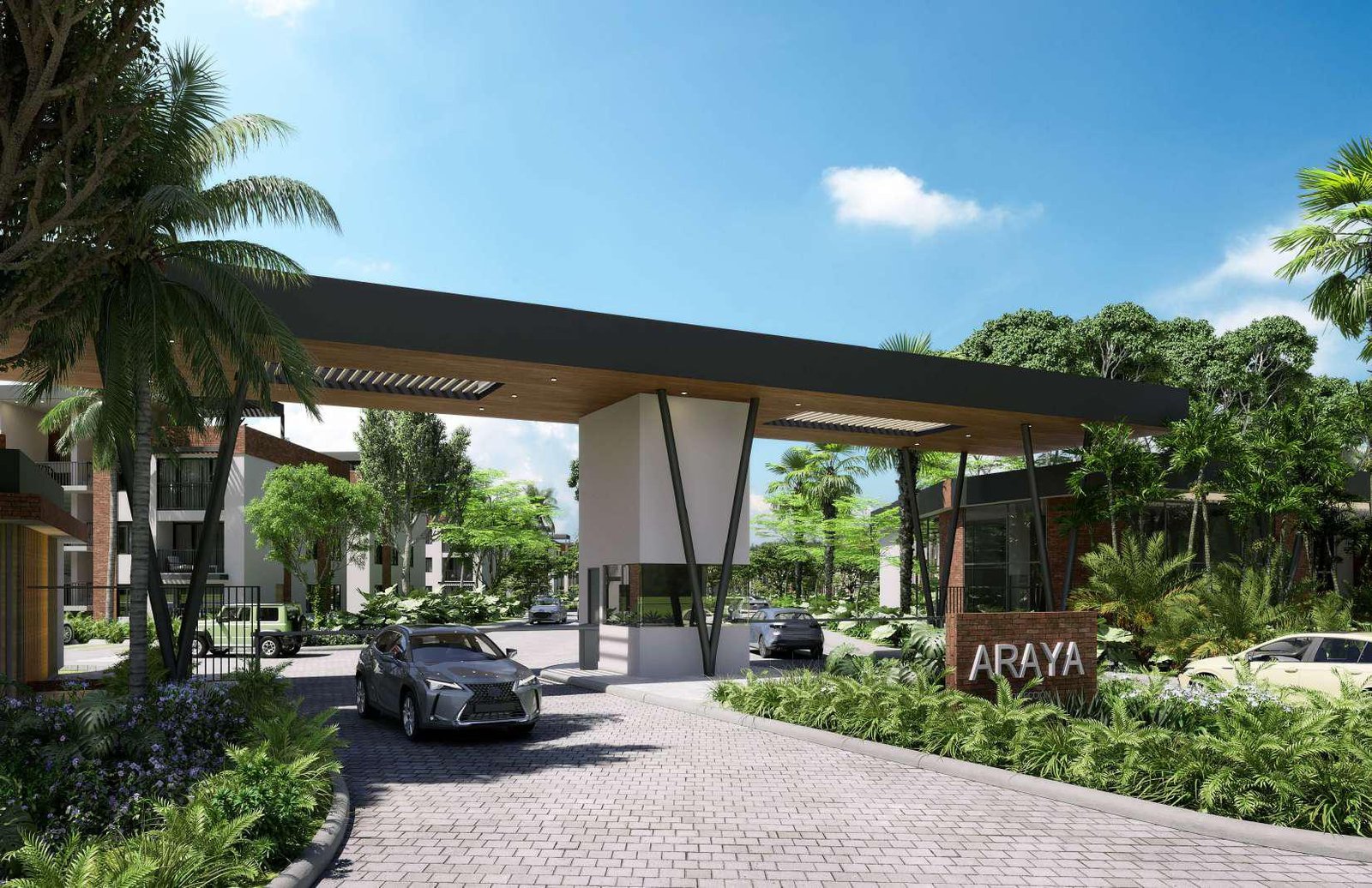 La entrada al complejo Araya, tanto vehicular como peatonal, está controlada por una portería exterior con garita, en un espacio dedicado de 170 metros cuadrados.